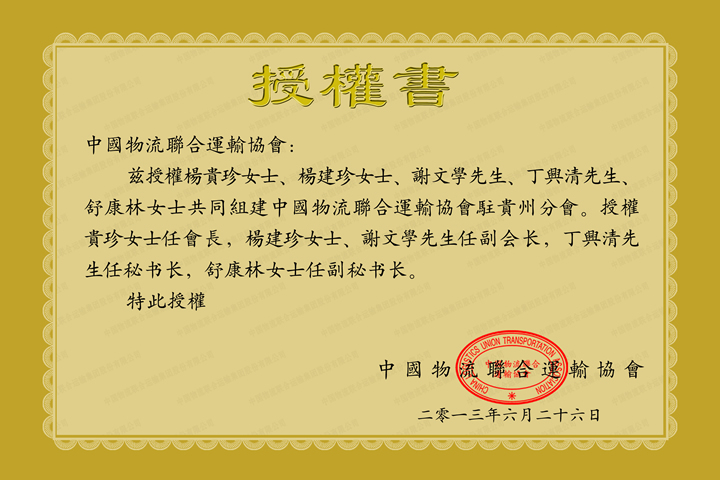 中国物流联合运输协会贵州分会授权书